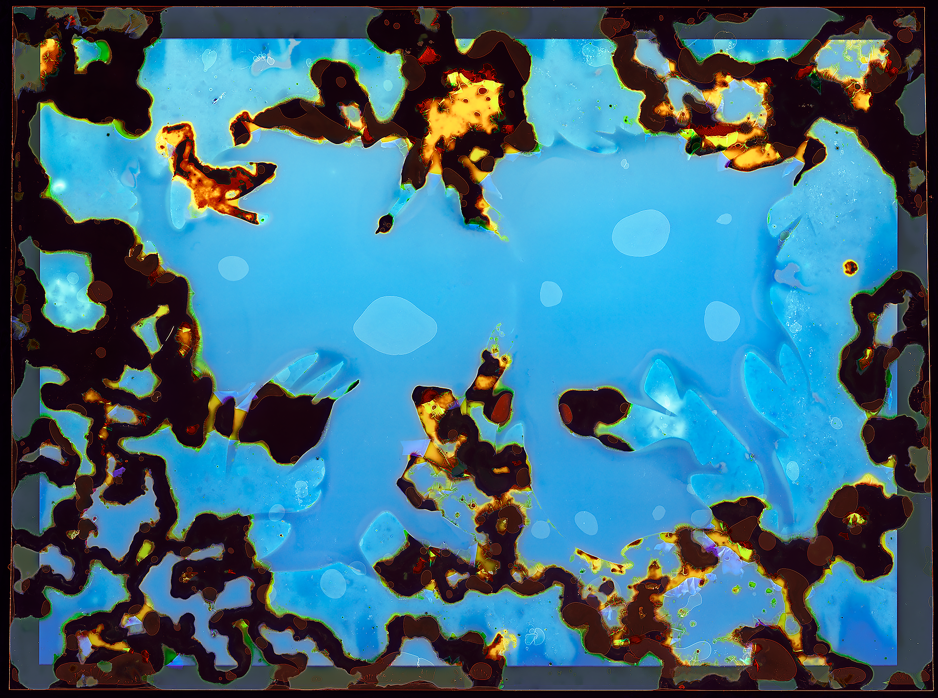Biologically-processed photographic artwork "Incubator-#2" (2019) from Morphological Life Form Studies Lab featuring azure cellular suspension within labyrinthine emulsion decay boundaries, demonstrating fractal reorganization into enclosed life-structure formations.