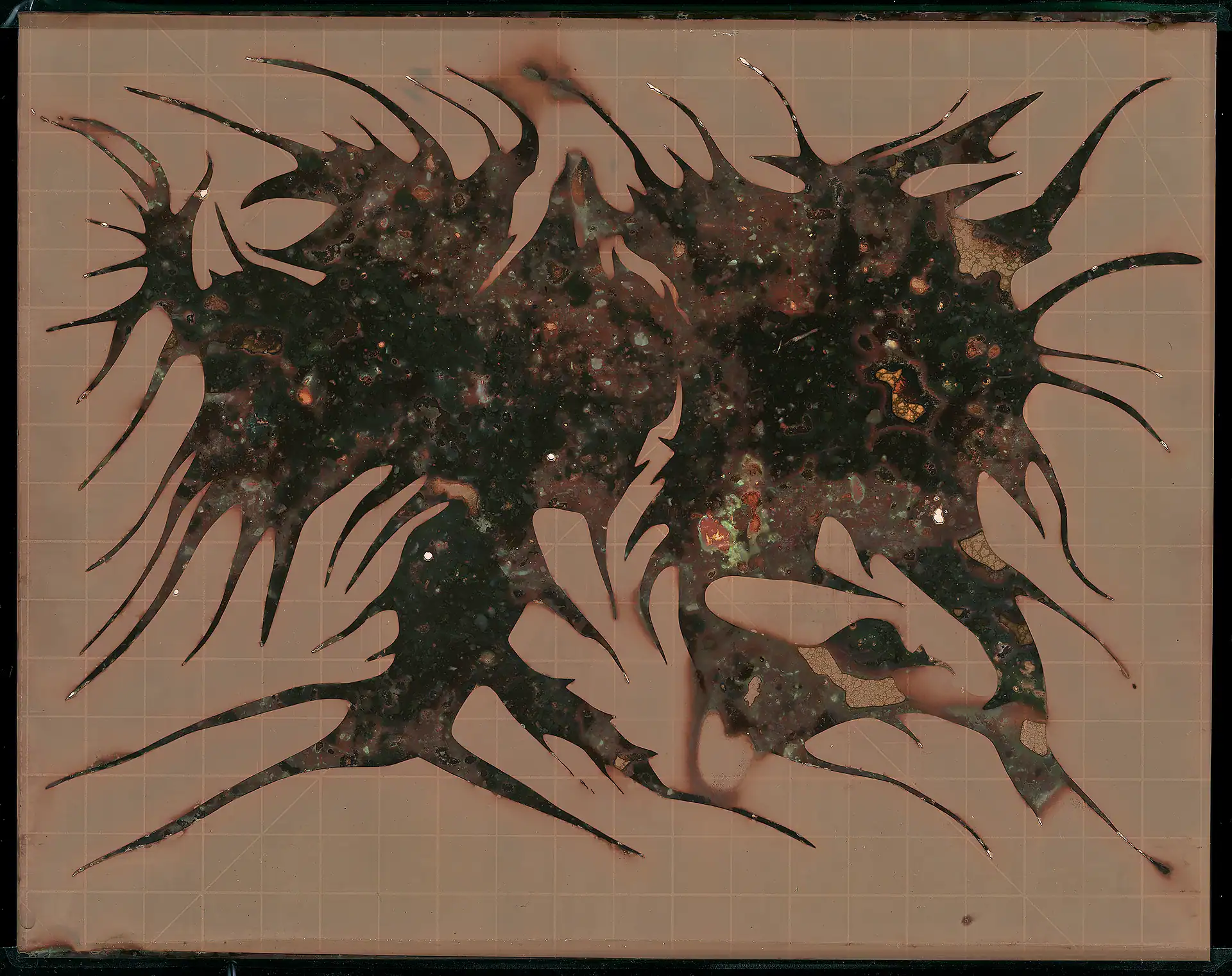 Biologically-processed photographic artwork "Taste Of Blood And Violence #1" (2023) presenting emulsion decay formations with polychromatic fragments, demonstrating fractal geometry reorganization into amorphous life-structure silhouettes through biological imaging processes.