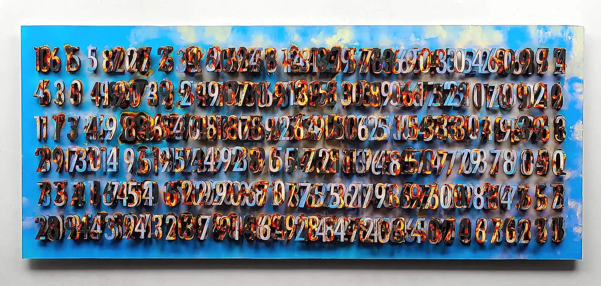 Mathematical sequence artwork featuring Fibonacci progression with biological soil treatment creating varied decomposition effects on azure background. Numerals physically extracted from print surface form three-dimensional relief coated with earth material, bridging abstract mathematical principles and tangible natural phenomena through organic transformation processes.